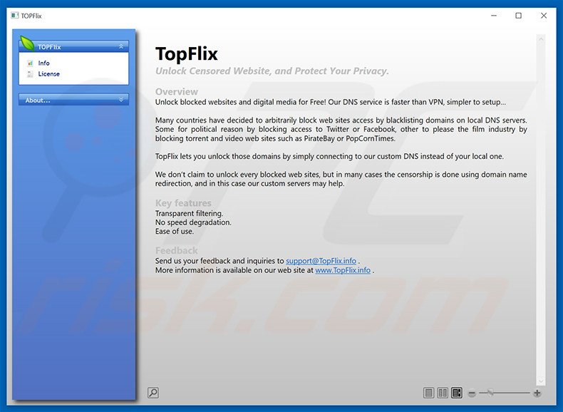 Deze valse applicatie is virtueel identiek aan DNS Unlocker, DNS-Keeper en een aantal andere mogelijk ongewenste programma's. Deze worden allemaal voorgesteld als legitiem en ze claimen nuttige functies te leveren ook al bieden ze geen toegevoegde waarde voor gebruikers. TopFlix en andere gelijkaardige applicaties worden enkel ontworpen om inkomsten te genereren voor de ontwikkelaars. Eerder dan de beloofde functies te leveren genereren ze intrusieve online advertenties en bespioneren ze de surfactiviteit op internet.