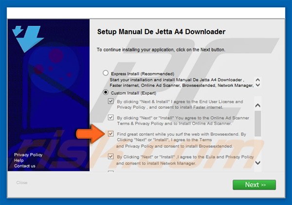 De meeste adware wordt verspreid als een 'bundel' samen met andere programma's. Om deze reden is het belangrijk elke stap van de download/installatie-procedures te controleren. Gebruik daartoe de 'Aangepaste' of 'Geavanceerde' instellingen en vink alle bijkomende programma's uit.