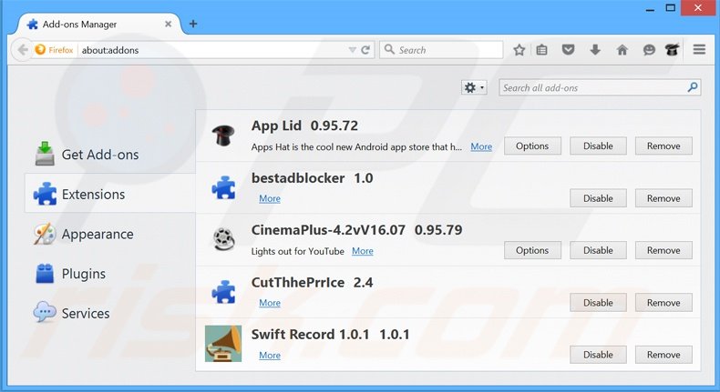 (in de rechterbovenhoek van het hoofdscherm) selecteer "Add-ons". Klik op "Extensies" en verwijder alle recent geïnstalleerde en verdachte extensies.