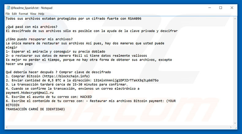 De geopende pop-up en alle aangemaakte bestanden bevatten een losgeldbericht in het Engels, Italiaans en Turks. Dit bericht stelt dat bestanden versleuteld werden en dat ze enkel kunnen hersteld worden met een private sleutel. Jammer genoeg klopt dit. RSA-4096 is een assymetrisch algoritme wat betekent dat een unieke publieke en private sleutel worden gecreëerd, respectievelijk voor de versleuteling en ontsleuteling. Cybercriminelen bewaren de private sleutel op een server op afstand en proberen deze aan het slachtoffer te verkopen. De prijs is momenteel onbevestigd - berichten met een vraag om losgeld noemen .5 Bitcoin (momenteel met een waarde van ~$2260), de pop-up stelt dat het om $2000 in Bitcoins gaat en de afbeelding vermeldt .15 Bitcoin. Het is wellicht zo dat slachtoffers gedetailleerde informatie zullen ontvangen na het contacteren van de ontwikkelaars van Hacked. In elk geval mag je deze criminelen nooit vertrouwen. Deze personen zullen wellicht hun slachtoffers oplichten - ze negeren hen eenvoudigweg na het ontvangen van de betaling. Betalen garandeert daarom niet dat je bestanden ooit zullen ontsleuteld worden. We bevelen je ten zeerste aan alle vragen om contact te negeren en geen losgeld te betalen. De kans is groot dat je je geld zult verliezen en niets in ruil zult krijgen. Verder zul je de kwaadaardige activiteiten van de criminelen ermee steunen. Er bestaan jammer genoeg geen tools die beschikbaar zijn om de RSA-4096 cryptografie te kraken en de bestanden gratis te herstellen. Om deze redenen is de enige oplossing het herstellen van bestanden uit een backup.
