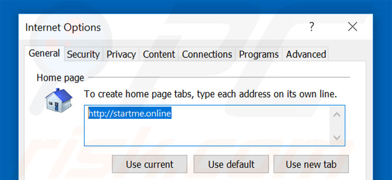 (in de rechterbovenhoek van Internet Explorer) selecteer "Internet Opties", in het geopende scherm verwijder je hxxp://startme.online/ en geef je het domein van je voorkeur in dat zal openen elke keer als je Internet Explorer opstart.