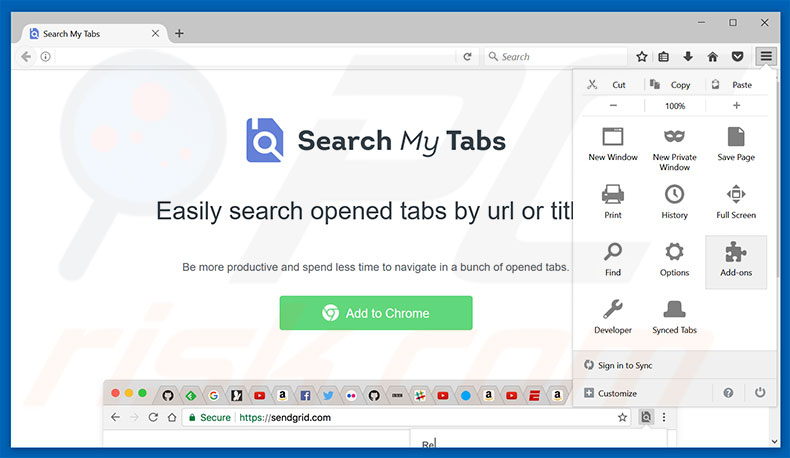 (in de rechterbovenhoek van het hoofdscherm), selecteer "Add-ons." Klik op "Extensies" en in het geopende scherm verwijder "Search My Tabs".