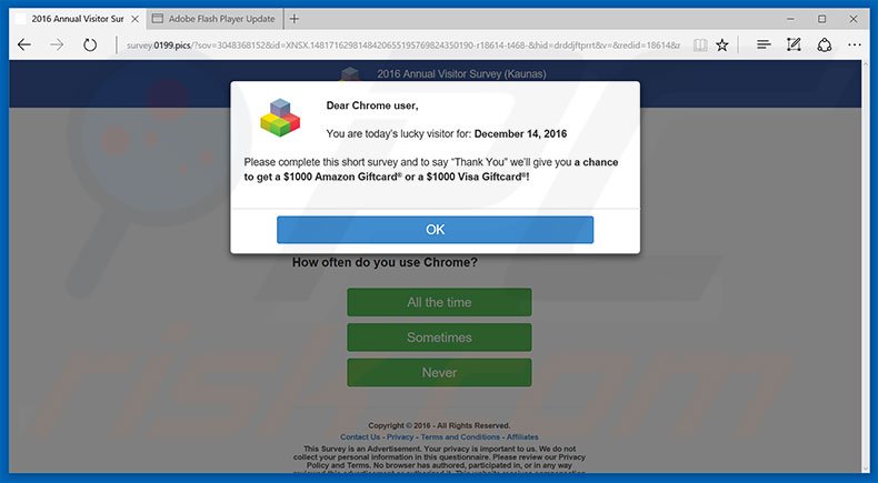 De "You Are Today's Lucky Visitor"-pop-up meldt dat een cadeaukaart van Amazon of van Visa kan gewonnen worden ter waarde van 1000 dollar. Om kans te maken moeten de slachtoffers een korte enquête invullen. Wees je ervan bewust dat dit vals is, de "You Are Today's Lucky Visitor"-pop-up is slechts oplossing. Cybercriminelen proberen zoveel mogelijk gebruikers enquêtes te laten invullen om zo inkomsten te genereren. De zogenaamde cadeaus bestaan niet. Je moet deze pop-up dan ook negeren en nooit een enquête invullen. Doe je dat wel dan ondersteun je het kwaadaardige bedrijfsmodel van de cybercriminelen. Adware genereert ook reclames in de vorm van pop-ups, banners enz. via virtuele lagen. Zo'n virtuele laag maakt de plaatsing van grafische inhoud bovenop elke website mogelijk. De vertoonde advertenties verbergen vaak de onderliggende inhoud van bezochte websites en ze kunnen linken naar andere kwaadaardige websites. Hierdoor is het klikken erop riskant en kan dit leiden tot andere computerbesmettingen. Bovendien verzamelt de adware informatie over de surfactiviteit van gebruikers op internet. De datatypes die ingezameld worden bevatten, maar zijn niet beperkt tot, IP-adressen, zoekopdrachten, url's van bezochte websites, geolocaties, internetaanbieders en muis- en toetsenbordactiviteit. De ingezamelde data kan persoonlijke gegevens bevatten die de ontwikkelaars van adware delen met derden, die inkomsten genereren door het misbruiken van persoonlijke gegevens. Dit kan ernstige schendingen van de privacy veroorzaken of zelfs identitteitsdiefstal. We bevelen ten zeerste aan alle applicaties van het adware-type onmiddellijk te verwijderen.