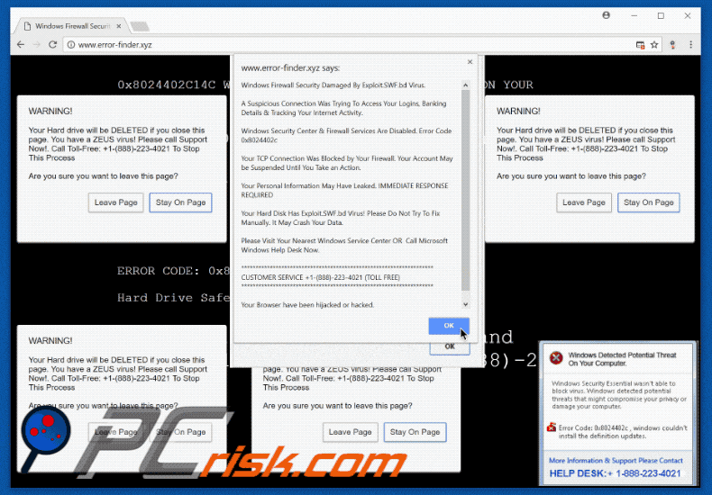 Uw harde schijf wordt vernietigd wanneer u deze pagina sluit. U hebt een ZEUS-virus! Bel nu support! Bel gratis: + 1- (888) -223-4021 om dit proces te stoppen.Windows ontdekte potentiële bedreiging op uw computer.