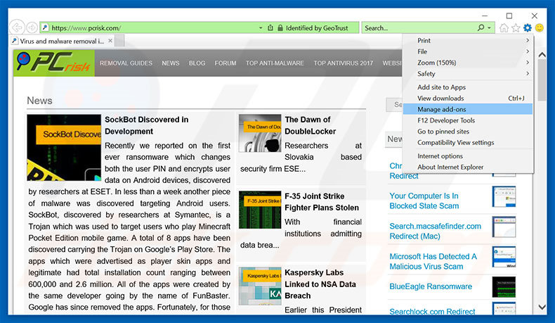 (in de rechterbovenhoek van Internet Explorer), selecteer "Beheer Add-ons". Zoek naar recent geïnstalleerde verdachte add-ons, selecteer deze en klik op "Verwijderen"