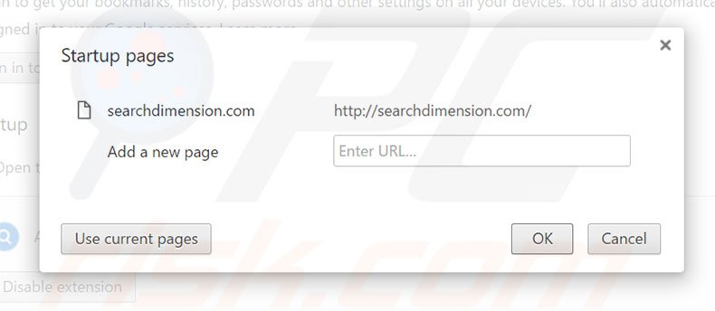 (rechterbovenhoek van Google Chrome) selecteer "Instellingen". In de "Bij het opstarten" sectie klik je op "pagina's instellen", beweeg je muis over hxxp://searchdimension.com/ en klik op het x symbool. Nu kan je de website van je voorkeur toevoegen als je startpagina.