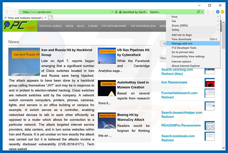 (in de rechterbovenhoek van Internet Explorer), selecteer "Beheer Add-ons". Zoek naar recent geïnstalleerde verdachte add-ons selecteer deze en klik op "Verwijderen".
