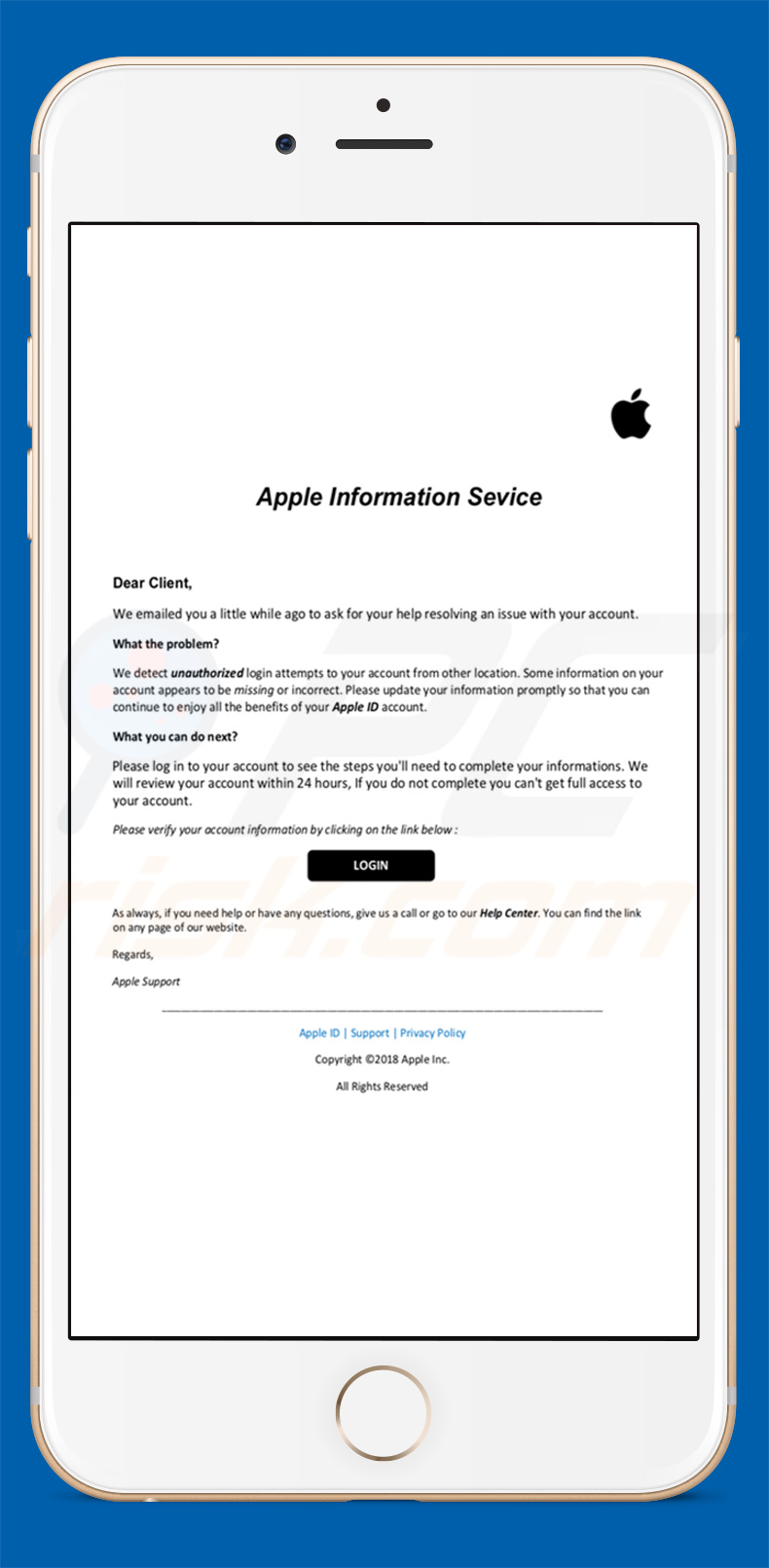 Update 10 December, 2018 - Cybercriminelen hebben een bijgewerkte versie van de spamcampagne "Apple e-mail virus" uitgebracht, die zich richt op Mac-gebruikers. In plaats van de Hanicitor-trojan van Hancitor, probeert deze variant om gebruikers te misleiden zodat ze accountreferenties invoeren. Dit wordt gedaan om accounts te stelen.