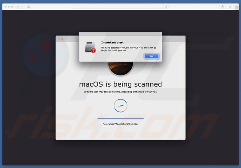 Eénmaal bezocht, geeft deze misleidende pagina een pop-upvenster weer dat een "Belangrijke waarschuwing" zou zijn. De website zegt dat het vier virussen heeft ontdekt en moedigt zijn bezoekers aan om op "OK" te klikken om het reparatieproces te starten. Het voert een valse virusscan uit die, als hij klaar is, zegt dat de computer geïnfecteerd is met een paar trojans, een adware-programma en een ander virus. De scanresultaten worden weergegeven in een venster dat vermomd is als macOS Security Center en dat de mensen ertoe aanzet deze virussen zo snel mogelijk te verwijderen (of ze zouden zogezegd "systeemschade, gegevensverlies, enzovoort veroorzaken"). De gebruikers worden aangemoedigd om de nieuwste verwijderingssoftware te downloaden door op de knop "Downloaden" te klikken. Merk op dat Apple zelf hier niets mee te maken heeft. Het wordt afgeraden om programma's van deze websites te downloaden. Als ze geopend worden moet u ze negeren of niet serieus nemen.