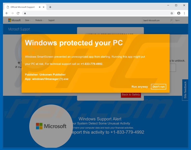 Bij bezoek vertoont deze website een pop-upvenster dat voorgesteld wordt als een viruswaarschuwing van Microsoft en waarin er staat dat de computer van de bezoeker geblokkeerd is. Het moedigt de gebruikers aan om het venster niet te sluiten of hun computers niet opnieuw te starten. Er wordt uitgelegd dat de computer geblokkeerd wordt omdat er illegale software op het besturingssysteem geïnstalleerd is, of omdat de registratiesleutel van het systeem illegaal is, of omdat het besturingssysteem gehackt is en virussen verspreid worden. Om hun computers te "heractiveren", worden de gebruikers aangemoedigd om contact op te nemen met de hulplijn van Microsoft via het nummer +1-833-779-4992. Een ander pop-upvenster (het oranje) zegt dat Windows de computer heeft beveiligd met de SmartScreen-functie. Het heeft een ongeautoriseerde toepassing voorkomen die schade kan veroorzaken. Volgens deze pop-up heet die applicatie "windows10manger(1).exe". Net als het vorige pop-upvenster, moedigt ook dit venster mensen aan om contact op te nemen met de zogenaamde 'technische ondersteuning', en bovendien vraagt het of die applicatie toch geopend moet worden of niet. Het maakt echter niet uit, omdat al deze informatie niet vertrouwd mag worden. Met andere woorden, het is een valse viruswaarschuwing, een oplichting die gebruikt wordt om mensen te misleiden zodat ze contact opnemen met de oplichters die het ontworpen hebben. Het moet echter genegeerd worden en het venster moet gesloten worden. Als dit niet op een normale manier kan worden gedaan, dan raden we u aan om de hele browser te sluiten met Taakbeheer. De gesloten browsesessie mag niet hersteld worden, anders zou deze zwendelwebsite opnieuw geopend worden.
