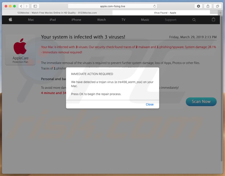 De apple.com-fixing.live-website geopend door 0123movies.com vertoont een valse viruswaarschuwing (meer informatie over deze website vindt u hier in dit artikel):