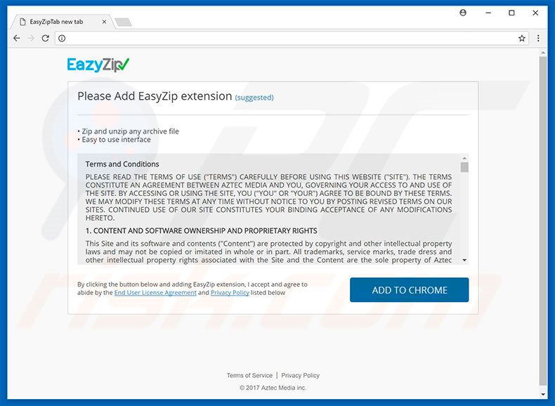 Easyziptab.com is een valse internetzoekmachine die, volgens de ontwikkelaars, de surfervaring op het web verbetert door verbeterde resultaten weer te geven en snelle toegang te bieden tot een aantal populaire sites (Twitter, Facebook, YouTube, enz.) Als men enkel deze claims beoordeelt dan kan easyziptab.com legitiem lijken, maar deze site wordt gepromoot met behulp van een browser-kapende app genaamd EazyZip, die beweert bestandscompressiefunctionaliteit aan te bieden. Bovendien verzamelen easyziptab.com en EazyZip allerlei gevoelige informatie met betrekking tot het surfgedrag op internet.