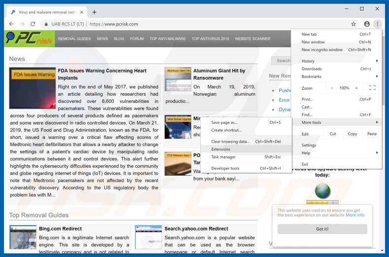 (in de rechterbovenhoek van Google Chrome), selecteer 'Meer hulpprogramma's' en klik op 'Extensies'. Zoek onlangs geïnstalleerde verdachte browser-add-ons en verwijder ze.