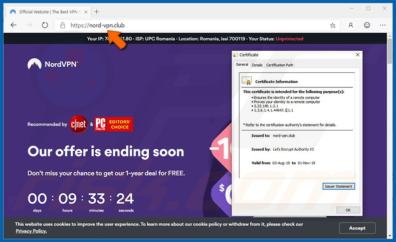 Screenshot van de NordVPN's website's (nordvpn.com) kloon (nord-vpn[.]club) ontwikkeld door de cybercriminelen: