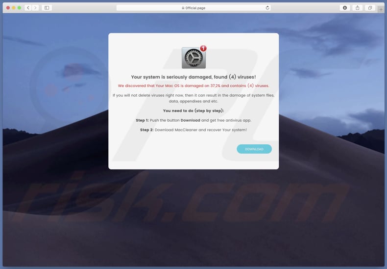 In eerste instantie geeft deze oplichting een pop-upvenster weer waarin staat dat het Mac OS X-besturingssysteem geïnfecteerd is met vier virussen en beschadigd is. De bezoekers worden aangemoedigd om deze waarschuwing niet te negeren en om het systeem zo snel mogelijk van deze virussen te verwijderen. Zoals in een andere pop-up wordt vermeld, hebben de gedetecteerde virussen al 37,2% van het systeem beschadigd. Als ze niet meteen worden verwijderd, dan kunnen ze systeembestanden, gegevens, bijlagen, enzovoort beschadigen. De bezoekers worden zo aangemoedigd om op de knop "DOWNLOADEN" te klikken. Als u hierop klikt, dan wordt het programma Cleanup My Mac (het bestand maccleaner.pkg) gedownload. Volgens deze oplichtingspagina zou die knop echter moeten leiden tot het downloaden van MacCleaner (een andere ongewenste app). Zoals we in de inleiding al zeiden: de "Uw systeem is ernstig beschadigd, (4) virussen gevonden!"-oplichting kan gebruikt worden om verschillende toepassingen op verschillende tijdstippen te promoten. Maar geen van de apps die op dergelijke pagina's geadverteerd worden, mogen vertrouwd worden. Bovendien zijn alle claims over de gedetecteerde virussen onjuist. De beste manier om met dergelijke oplichtingspagina's om te gaan, is ze gewoon te negeren en te sluiten zodra ze worden geopend.