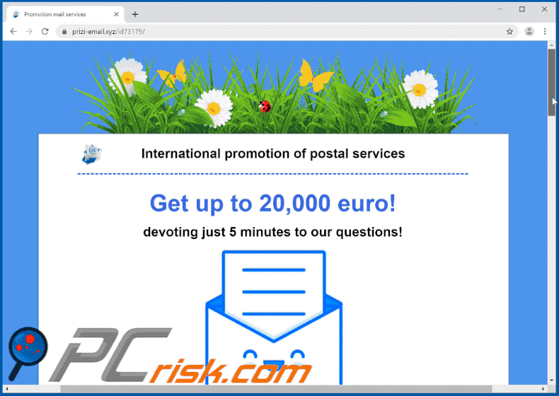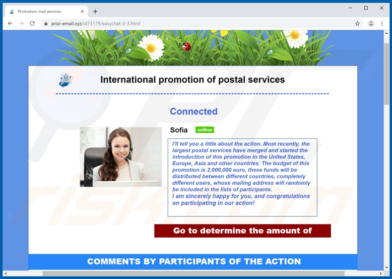 De "Internationale promotie van postdiensten" beweert dat de gebruikers tot twintigduizend euro kunnen winnen door slechts vijf minuten te besteden aan het beantwoorden van verschillende vragen. Verderop staat dat het bedrag tussen de tien en de twintigduizend euro kan liggen. De gebruikers worden aangespoord om op de onderstaande knop te klikken en een paar vragen te beantwoorden, voordat hun het winnende bedrag wordt bepaald. Deze knop leidt tot een snelle meerkeuzevragenlijst met verschillende e-mailgerelateerde vragen. Vervolgens worden de gebruikers naar een chat geleid, naar verluidt met de "Golden Email"-manager. In dit "gesprek" worden de gebruikers bedankt voor het beantwoorden van de vragen. Ze worden gevraagd of ze klaar zijn om de omvang van hun winst te achterhalen en over te dragen naar hun bankrekening/kaart. De chat biedt meer informatie over deze "Internationale promotie van postdiensten". Vermoedelijk zijn de grootste postdiensten samengevoegd en is de promotie begonnen in de Verenigde Staten, Europa, Azië en andere, niet-gespecificeerde landen. Deze "promotie" heeft een budget van twee miljoen euro, dat verdeeld wordt over verschillende provincies en willekeurig geselecteerde gebruikers. Na op een knop te klikken wordt de prijs getoond - de gebruikers krijgen de som te zien en worden aangespoord om op "Ga naar betaling" te klikken. Op deze pagina wordt aangegeven dat voor het overdragen van de prijs een bevestigingstoeslag betaald moet worden om de betalingsgegevens te verifiëren. Deze vergoeding is vijfentwintig euro en na betaling ervan zijn de gebruikers ervan verzekerd dat deze binnen de twaalf uur worden geretourneerd. Er wordt beweerd dat met deze betaling de identiteit van de gebruikers bevestigd en opgeslagen wordt voor toekomstige overdrachten. Bovendien is het niet relevant of de bankrekeningkaart euro ondersteunt of niet, omdat elke valuta automatisch geconverteerd wordt (en dit proces is naar verluidt gratis). Deze procedure is verplicht voor alle deelnemers. Als u wordt misleid om in te stemmen met deze voorwaarden, dan worden de gebruikers omgeleid naar een andere website, van waaruit de transactie uitgevoerd kan worden (de "bevestiging betaling"). Nadat deze vergoeding betaald is, ontvangen de gebruikers de beloofde prijs echter niet. Met andere woorden, ze worden opgelicht en krijgen er niets voor terug. De "Internationale promotie van postdiensten" en andere, soortgelijke "te mooi om waar te zijn" prijsaankondigingen zijn oplichtingen. Vertrouwen op hen en u zal financiële verliezen oplopen en uw persoonlijke privacy in gevaar brengen.