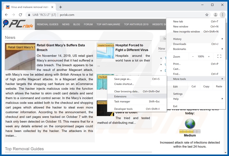 (in de rechterbovenhoek van Google Chrome), selecteer 'Meer hulpprogramma's' en klik op 'Extensies'. Zoek onlangs geïnstalleerde verdachte browser-add-ons en verwijder ze.