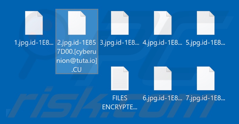 CU is de naam van malware afkomstig uit de Crysis/Dharma ransomware-familie. Omdat de CU ransomware bestanden codeert, krijgen alle bestanden een nieuwe naam volgens dit patroon - originele bestandsnaam, unieke ID per slachtoffer, het e-mailadres van de cybercriminelen en de extensie ".CU". Daarom zal een bestand zoals "1.jpg" hernoemd worden in bijvoorbeeld "1.jpg.id-1E857D00.[cyberunion@tuta.io].CU". Nadat dit proces is voltooid, wordt er een tekstbestand - "FILES ENCRYPTED.txt" op het bureaublad aangemaakt en wordt er een pop-upvenster weergegeven.