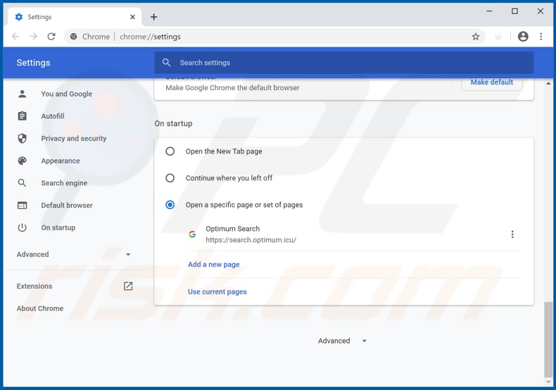 (in de rechterbovenhoek van Google Chrome), selecteer "Instellingen". In het gedeelte "Bij opstarten" schakelt u "OptimumSearch" uit, zoekt u naar de browserkaper URL (hxxp://www.search.optimum.icu). Klik op de drie vertikale puntjes en selecteer "verwijderen".